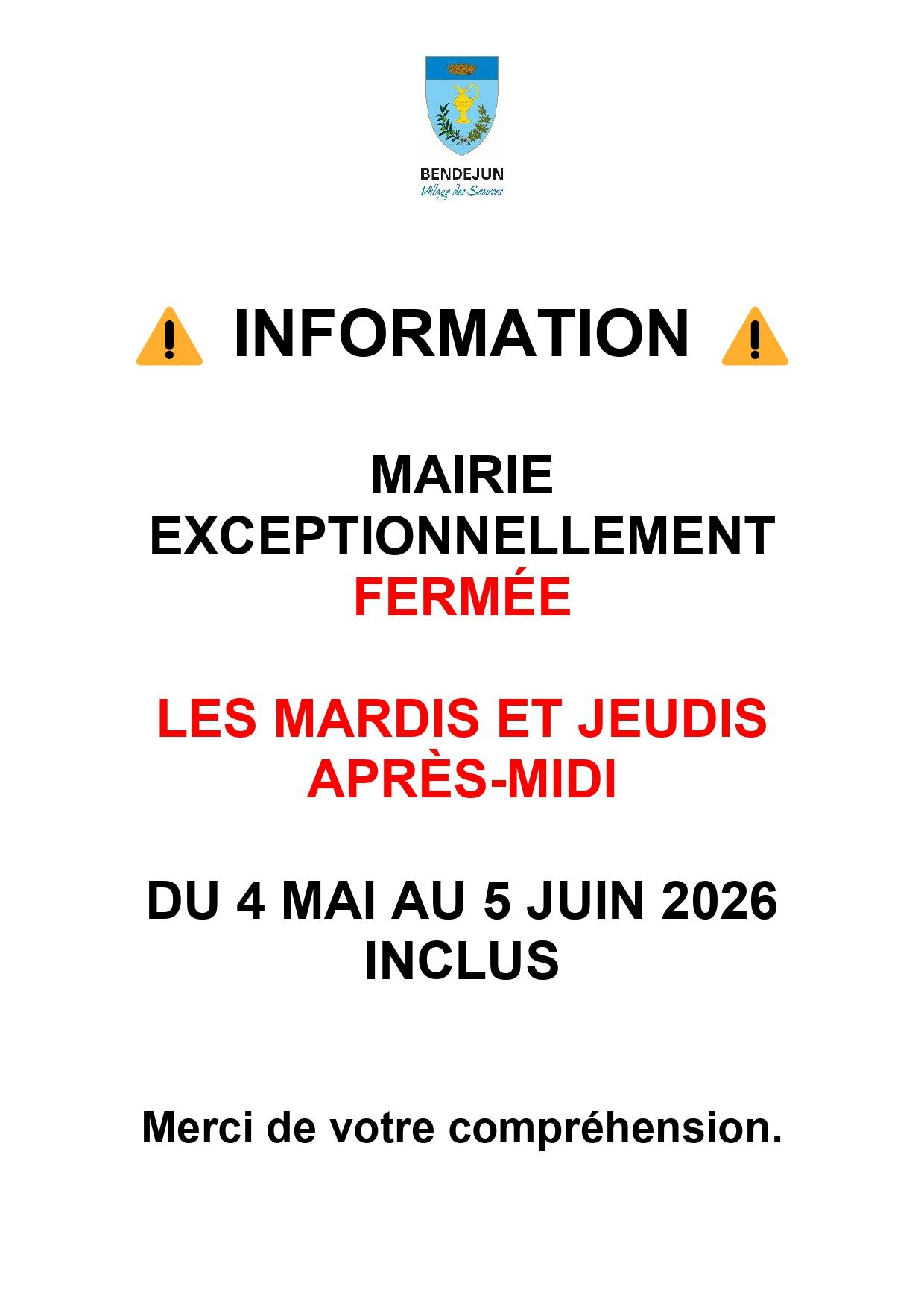 La mairie est exceptionnellement fermée les mardis et jeudis après-midi, du 4 mai au 5 juin 2026 inclus.